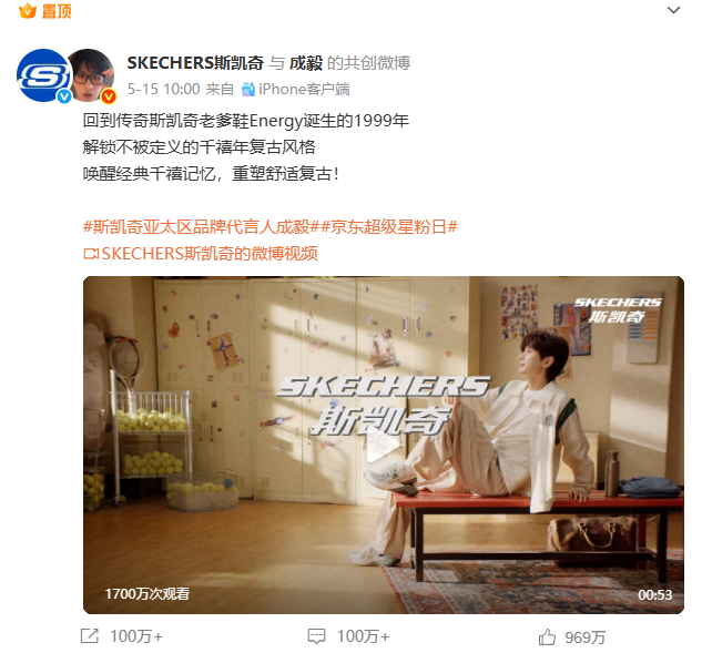 成毅官宣时百万级热度的微博 | 图源:微博@SKECHERS斯凯奇